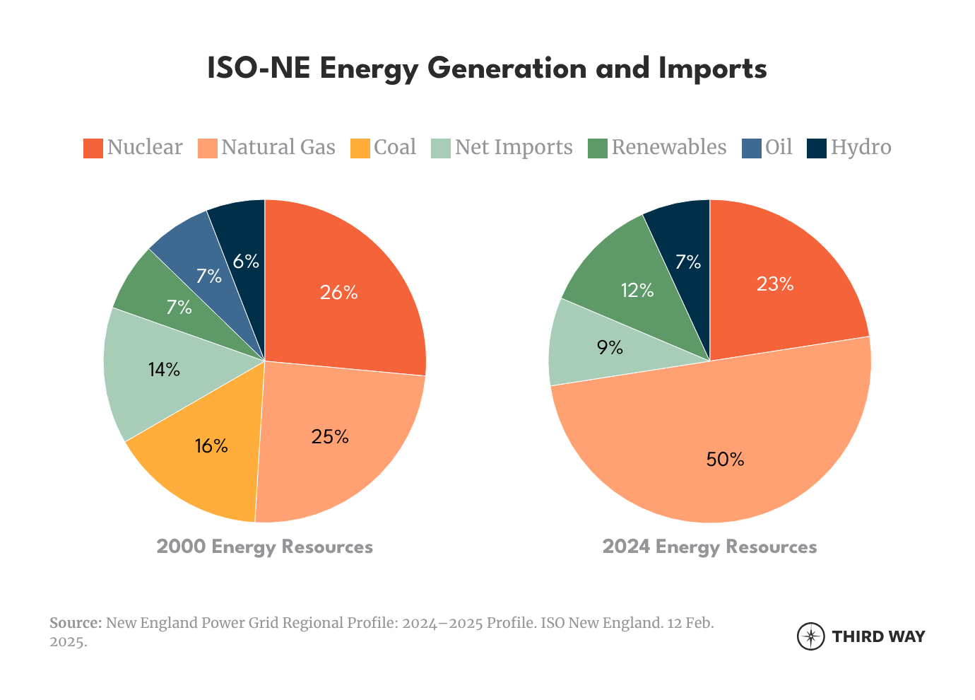 Maine may have set a goal of 100% clean energy by 2040, but the state still relies on a steady stream of natural gas to power homes and businesses. Natural gas’s share of generation in ISO-New England doubled between 2000 and 2024 to half of the regional energy mix, largely displacing higher-cost, aging coal and oil power plants. Non-hydro renewables, like solar and wind, have had a moderate increase from a combined total of 7% in 2000, growing to 12% of the regional energy mix in 2024, while the share of nuclear energy, long one of the most reliable sources of clean power, has actually decreased by 4 percentage points, thanks to plant closures.