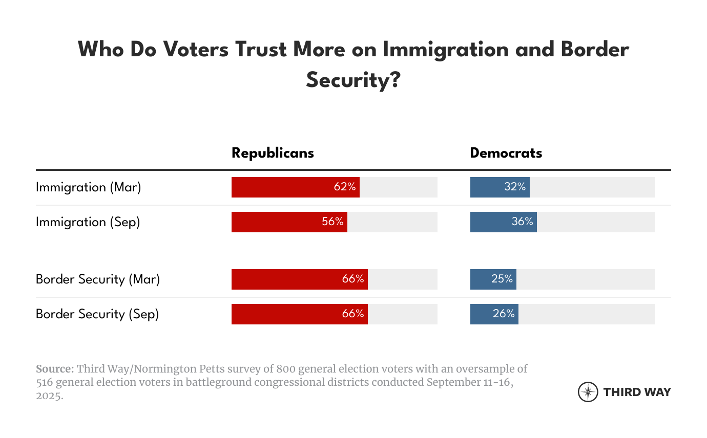 Over the past few months, the Trump Administration’s actions on immigration have only grown more extreme—from the deployment of the National Guard in major cities to ICE’s heavy-handed tactics in Chicago and the unprecedented push to deport unaccompanied children. Yet, even as voters watch these scenes unfold and lose confidence in the Administration’s approach, they still do not trust Democrats to manage immigration more effectively.