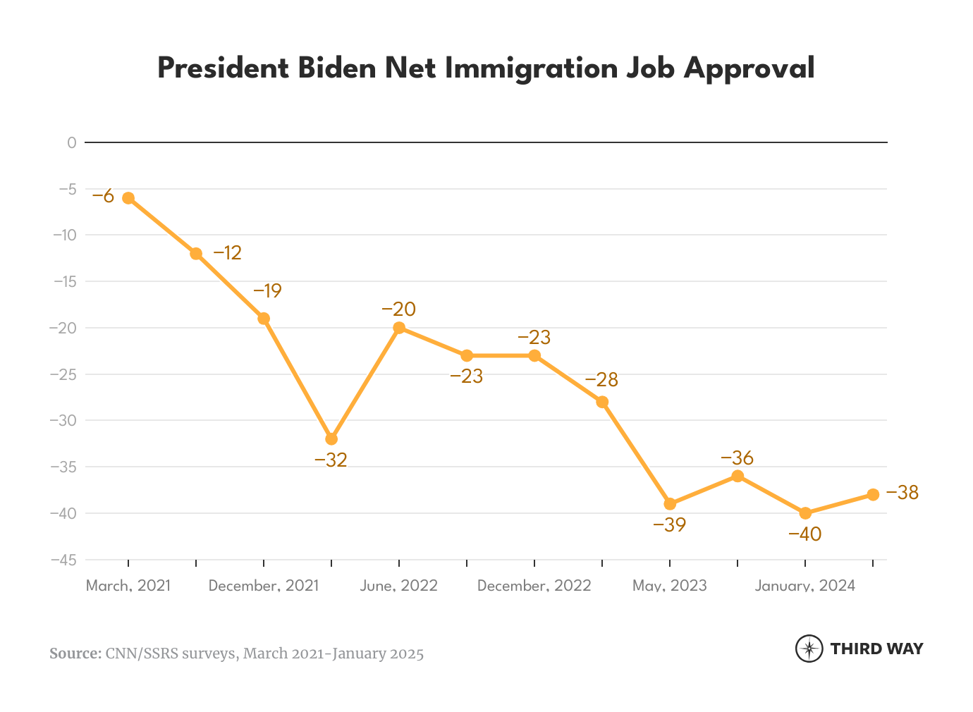 Without early-on, aggressive policies or public support to back up their approach on immigration, public trust in the Biden Administration’s handling of the issue dropped significantly—32 points over the course of the Administration. Democrats continue to the bear the brunt of that drop today.