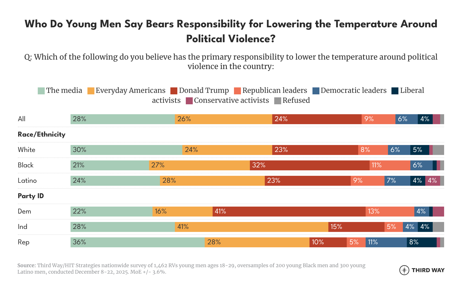 - Thirty-three percent of young men combined—including 15% of young Republican men—hold Trump (24%) and Republican leaders (9%) as the figures with the greatest responsibility for lowering the country’s temperature around political violence, while just 6% say Democratic leaders hold this responsibility.