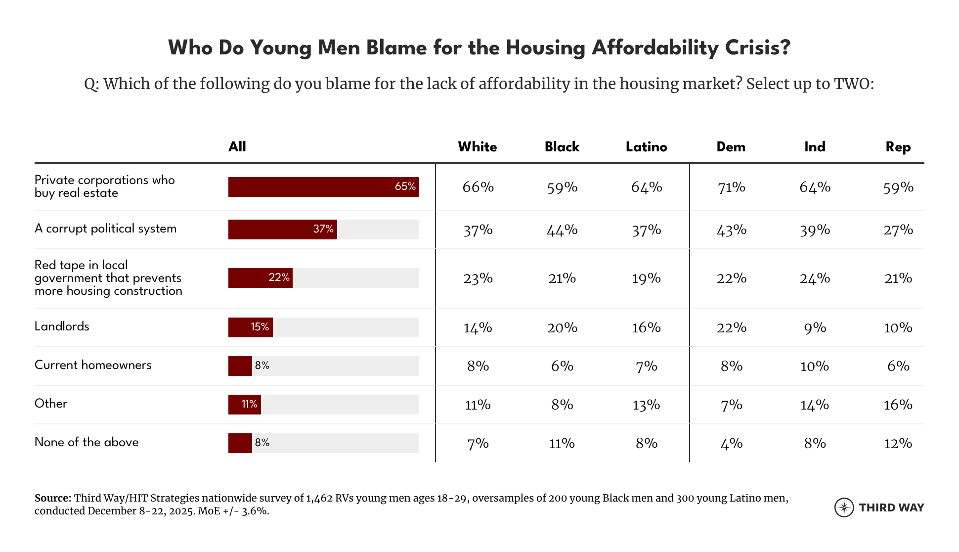 Following the cost of groceries, the issue that voters said was the second highest level of concern in 2024 was the cost of housing. Our survey shows that across race and political affiliation, respondents place the greatest blame for the lack of affordability in the housing market on private corporations. An overwhelming 65% of young men blame “private corporations who buy real estate,” followed by “a corrupt political system” (37%), and red tape in local government (22%).