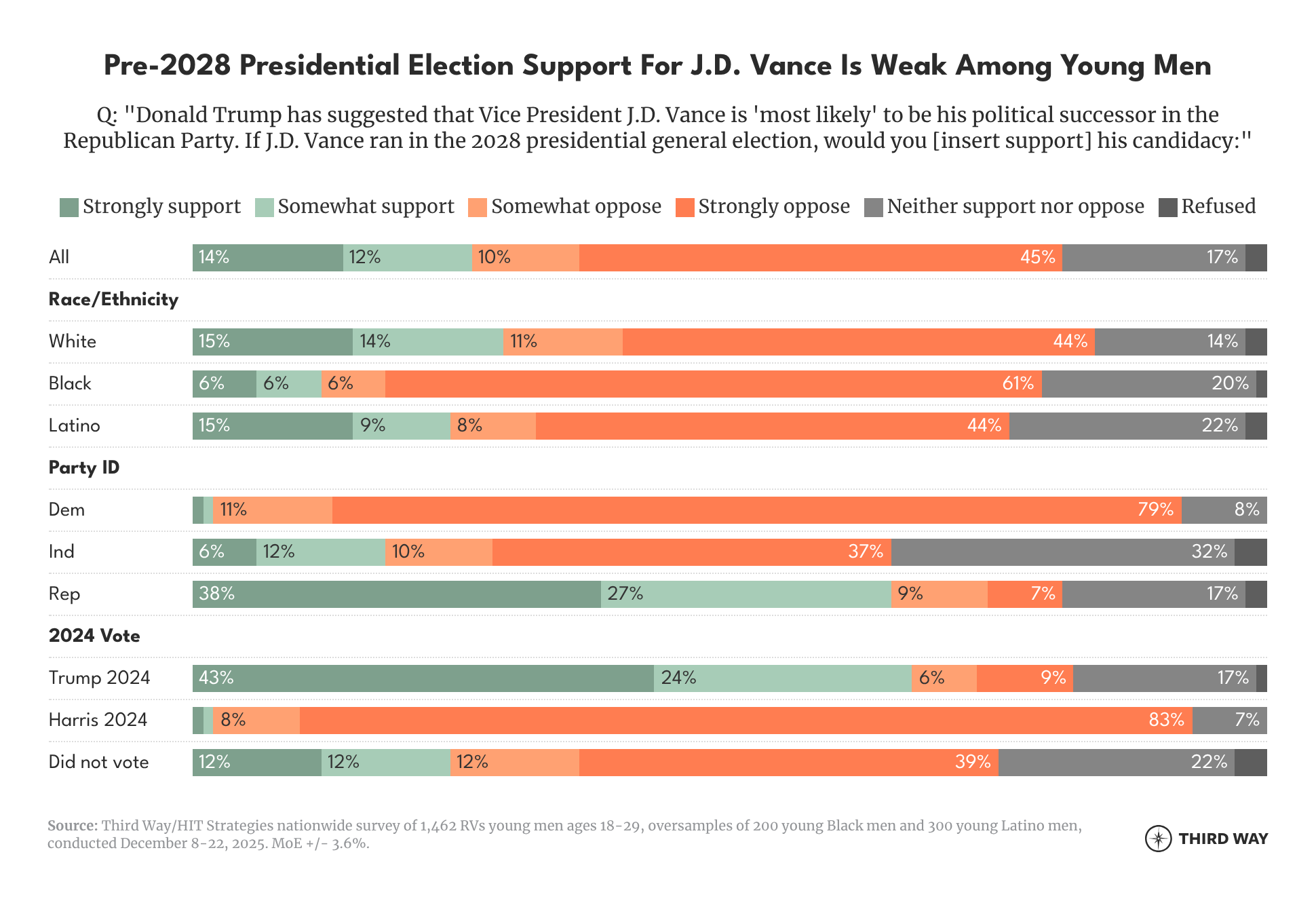 - A paltry 26% of young men would back a J.D. Vance presidential run in the 2028 general election, with 55% opposing and 17% unsure.