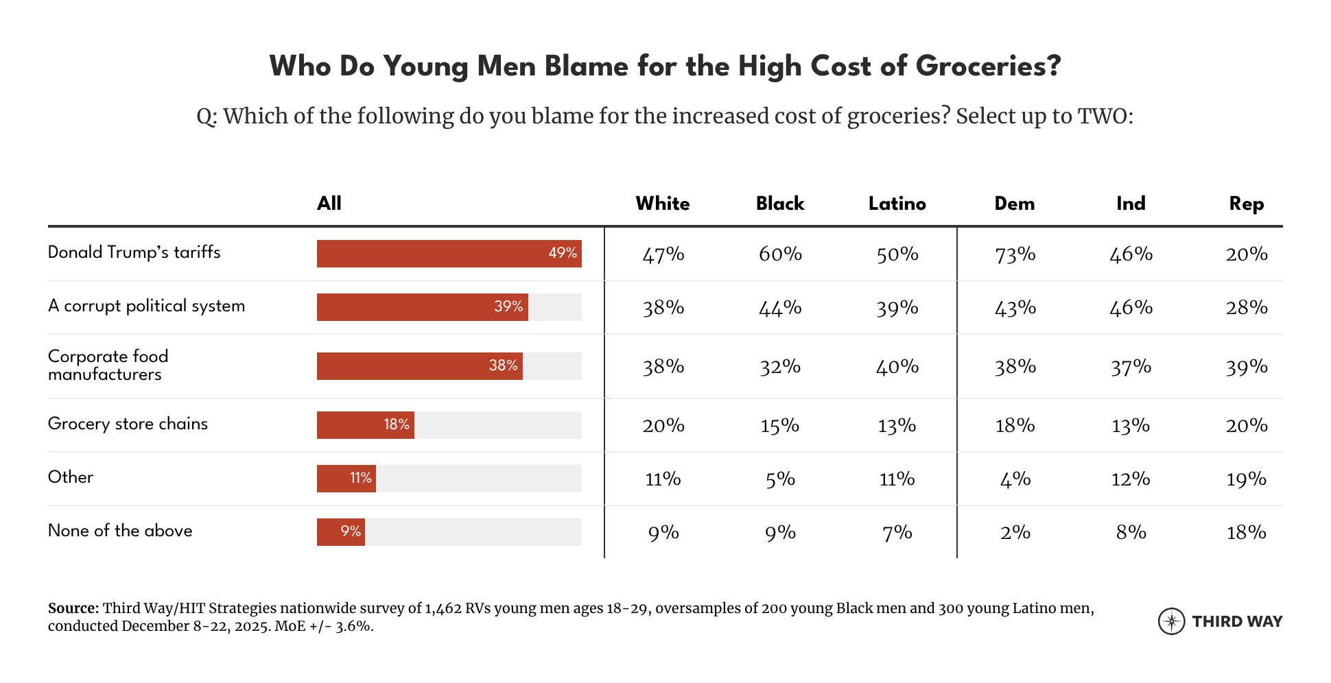 - Half of young men blame Trump’s tariffs for higher grocery costs (49%), while a larger share blame private corporations that purchase real estate for high housing costs (65%).