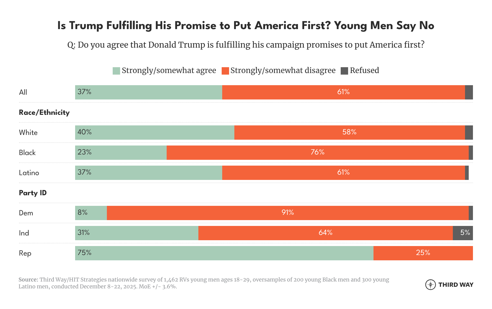 - A 61% supermajority of young men say Trump is not fulfilling his campaign promise to put America first, including 25% of young Republican men and 64% of Independents.