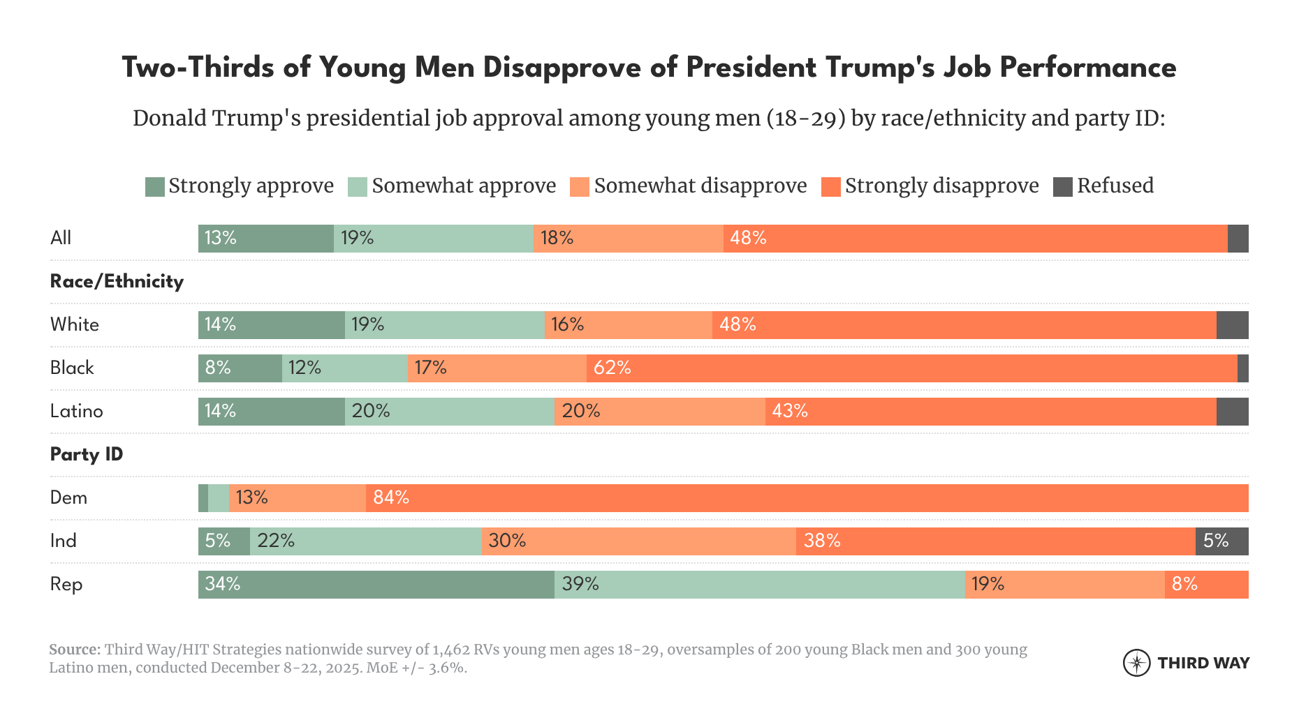 One year after being sworn in and winning 54% of young men in the 2024 election, Donald Trump is hemorrhaging support with this cohort. In last year’s focus groups, we found that young men who voted for Trump expressed serious concerns about his handling of the economy, tariffs, and immigration enforcement, though most were willing to take a wait-and-see approach as to how his policies panned out. To further analyze where the young male electorate stands today, Third Way worked with HIT Strategies to conduct a nationwide mixed mode survey in December 2025 of 1,462 young men, 18 to 29 years old, who are registered to vote.