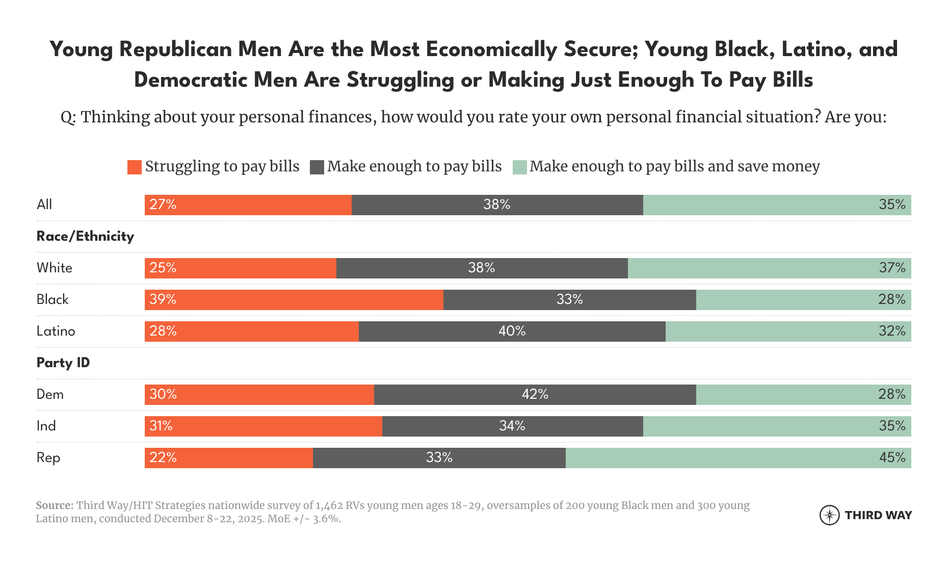 - Sixty-five percent of young men say that they are either struggling to pay bills (27%) or are just making enough to pay bills (38%).