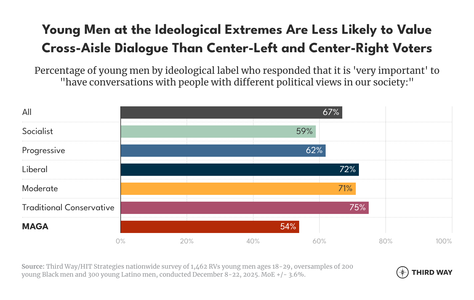 When we break this down by young men’s ideological label, we find that there’s a notable divide between the most ideologically extreme and the most moderate voters. Young men at the ideological extremes—those who identified as MAGA (54%), socialist (59%), and progressive (62%)—are less likely to say that cross-aisle dialogue is “very important” in our society than voters at the center-right and center-left—traditional conservatives (75%), liberals (71%), and moderates (71%).