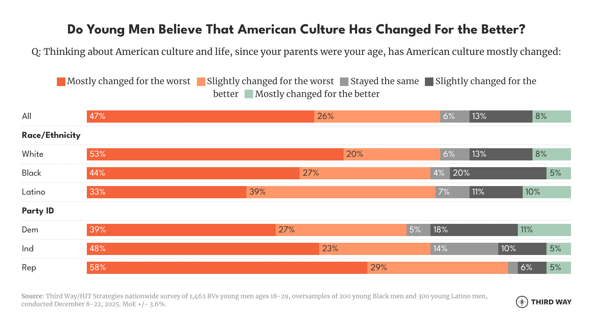 - An astonishing 73% of young men believe that American culture has changed for the worse since their parents were their age—20 points higher than the electorate overall.