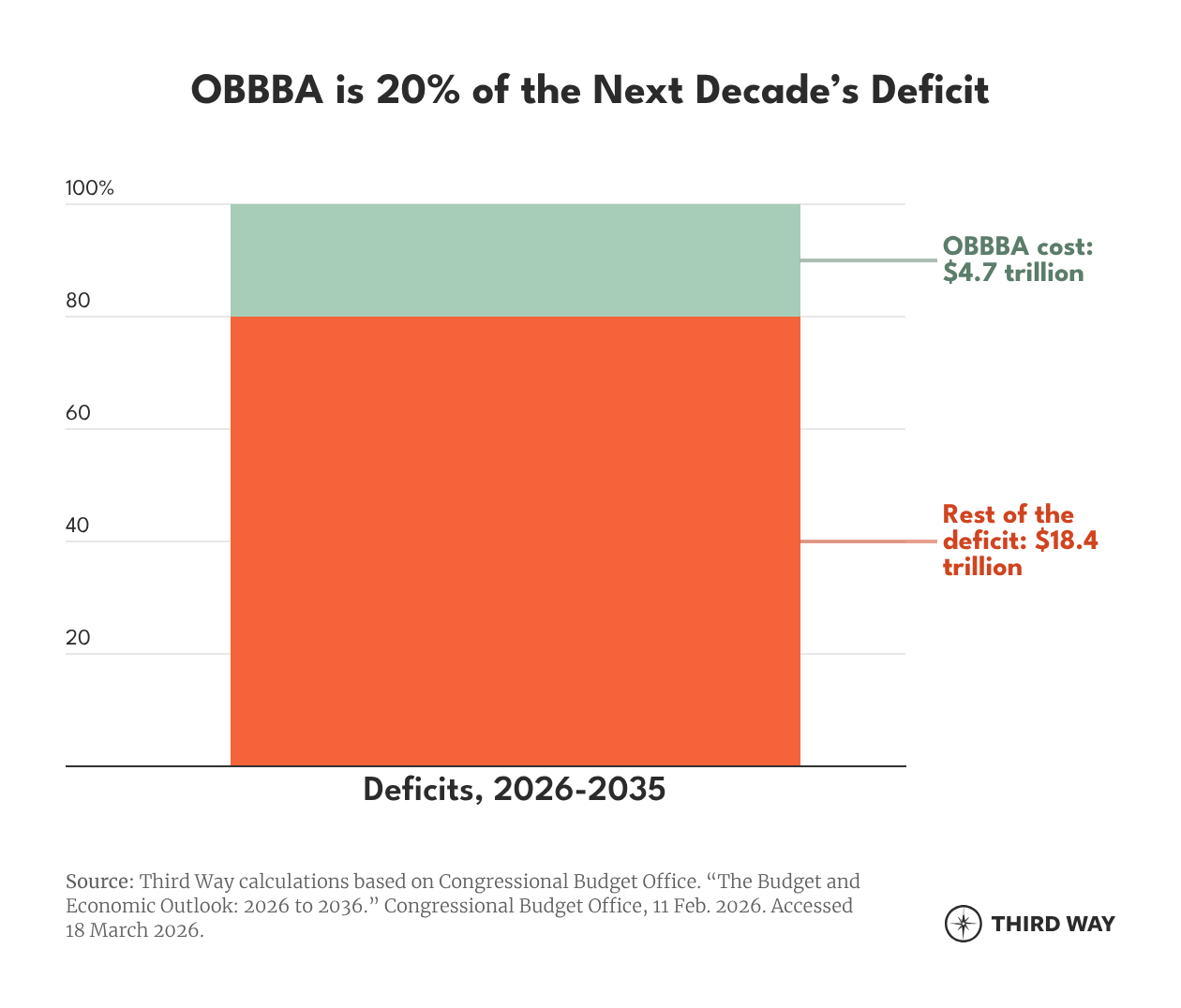 Third Way calculations based on Congressional Budget Office. “The Budget and Economic Outlook: 2026 to 2036.” Congressional Budget Office, 11 Feb. 2026, www.cbo.gov/publication/62105. Accessed 18 March 2026.