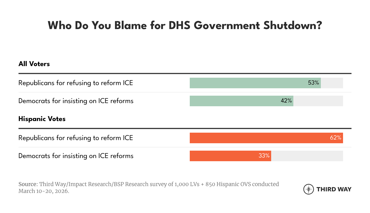 Given their strong support for these reforms, it is no surprise that voters are more likely to blame Republicans than Democrats for the current shutdown over Department of Homeland Security funding. Overall, respondents place more blame on Republicans for refusing to reform ICE than Democrats for insisting on ICE reforms, by an 11-point margin (53% to 42%). Among Independents, that gap grows to 15 points (54% to 39%), and among Latino voters, it rises to 29 points (62% to 33%).