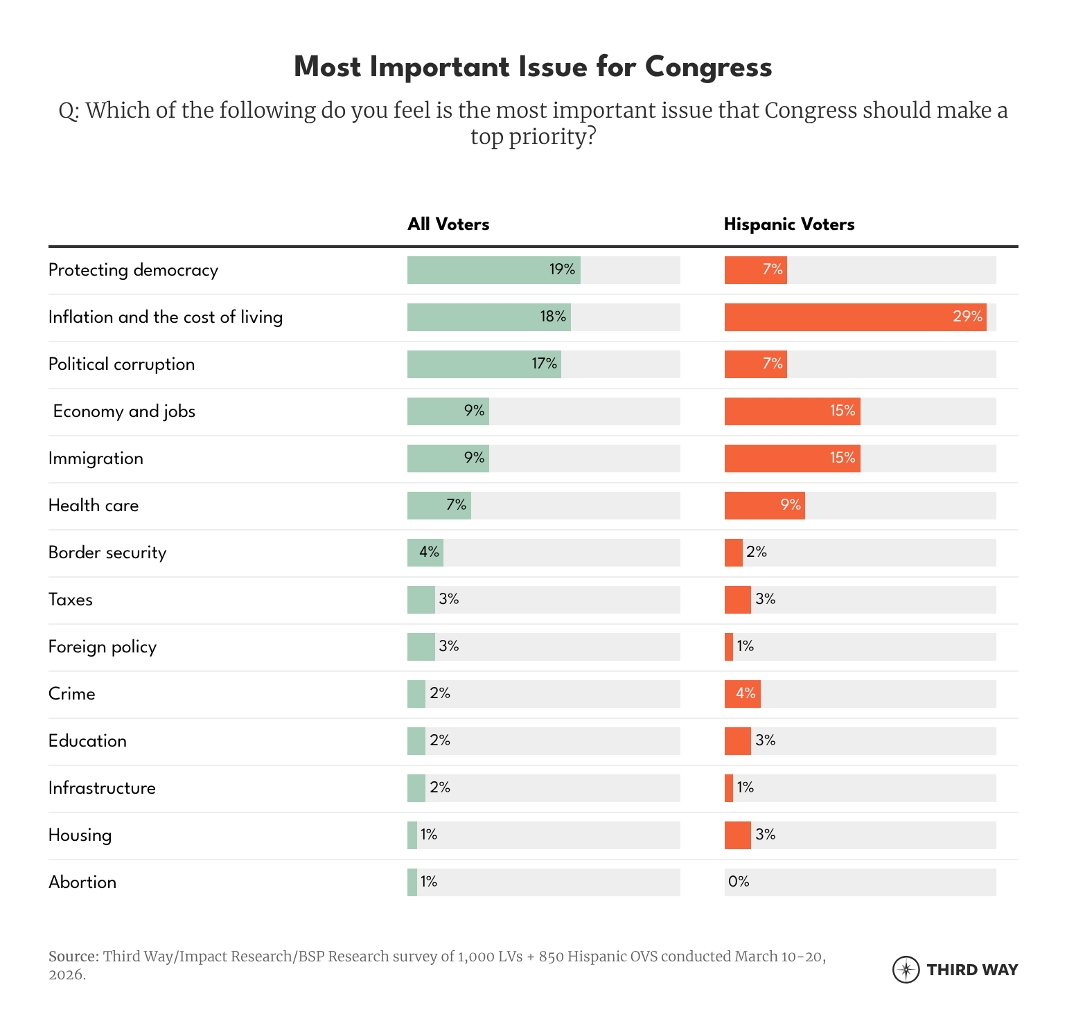 When voters overall were asked what issue was most important for Congress to prioritize, protecting democracy, inflation and the cost of living, and political corruption all topped the list with 19%, 18%, and 17%, respectively. Only 9% said immigration was the most important priority. Among Latino voters, pocketbook issues continue to dominate, with inflation and cost of living at 29% and jobs and the economy at 15%. Notably, immigration was tied with jobs, with 15% saying it should be Congress’s most important priority.