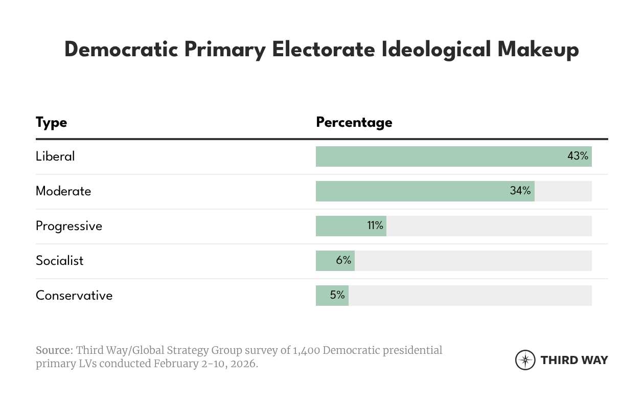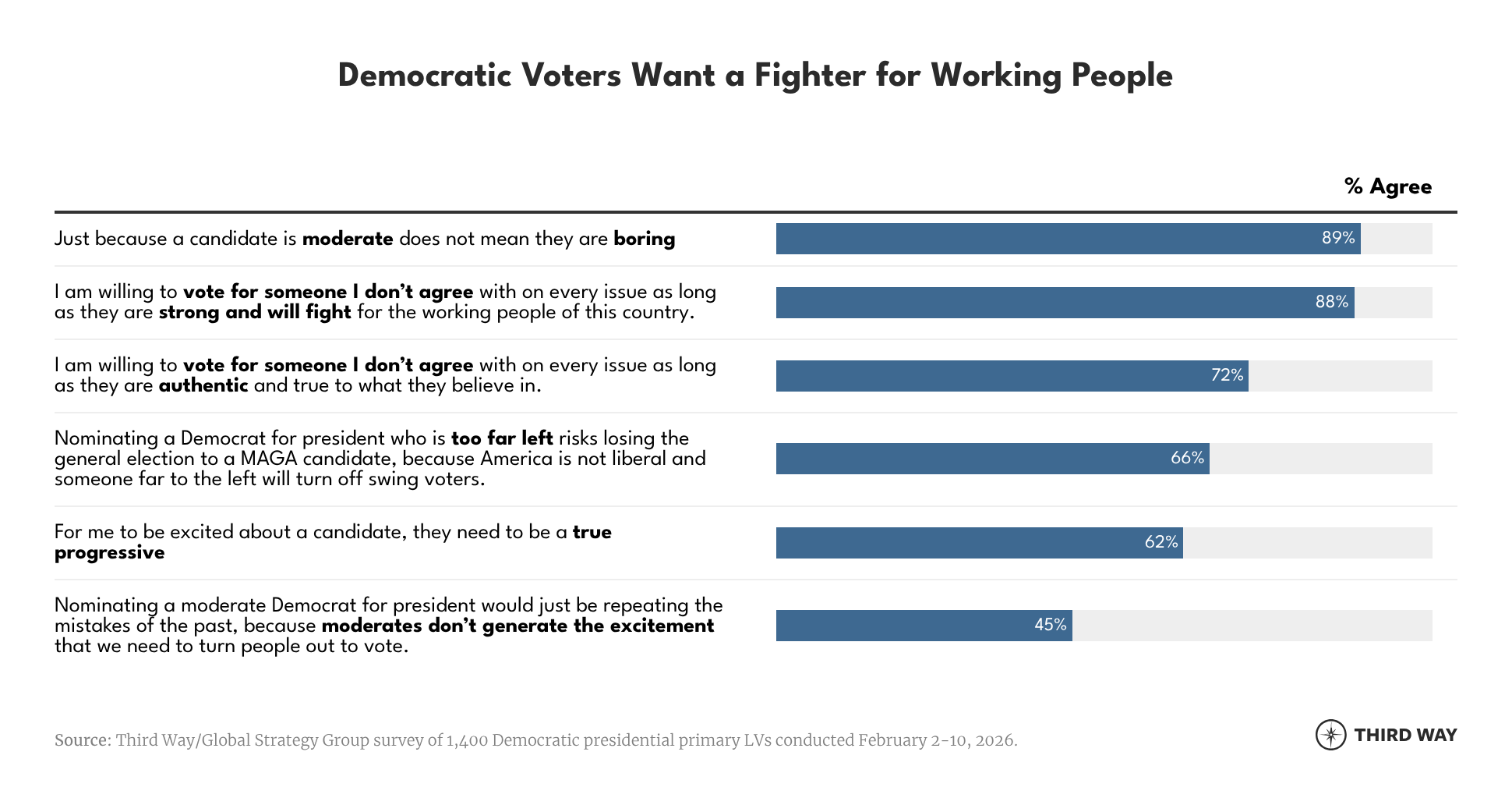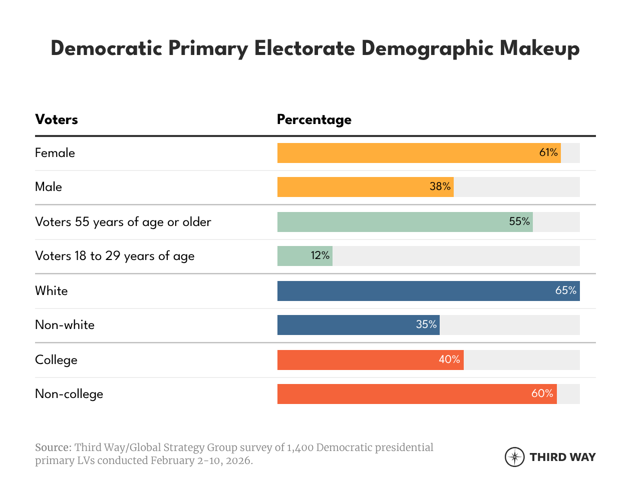 This February, Third Way worked with Global Strategy Group to conduct an online survey of 1,400 registered voters who said they are likely to vote in a Democratic Presidential primary. The purpose was to understand who the people are that will likely determine the next Democratic nominee for president, what they value, and what they want to see at the top of the ticket. This is the second such poll in a project that started in fall 2025, the first iteration of which can be found here.