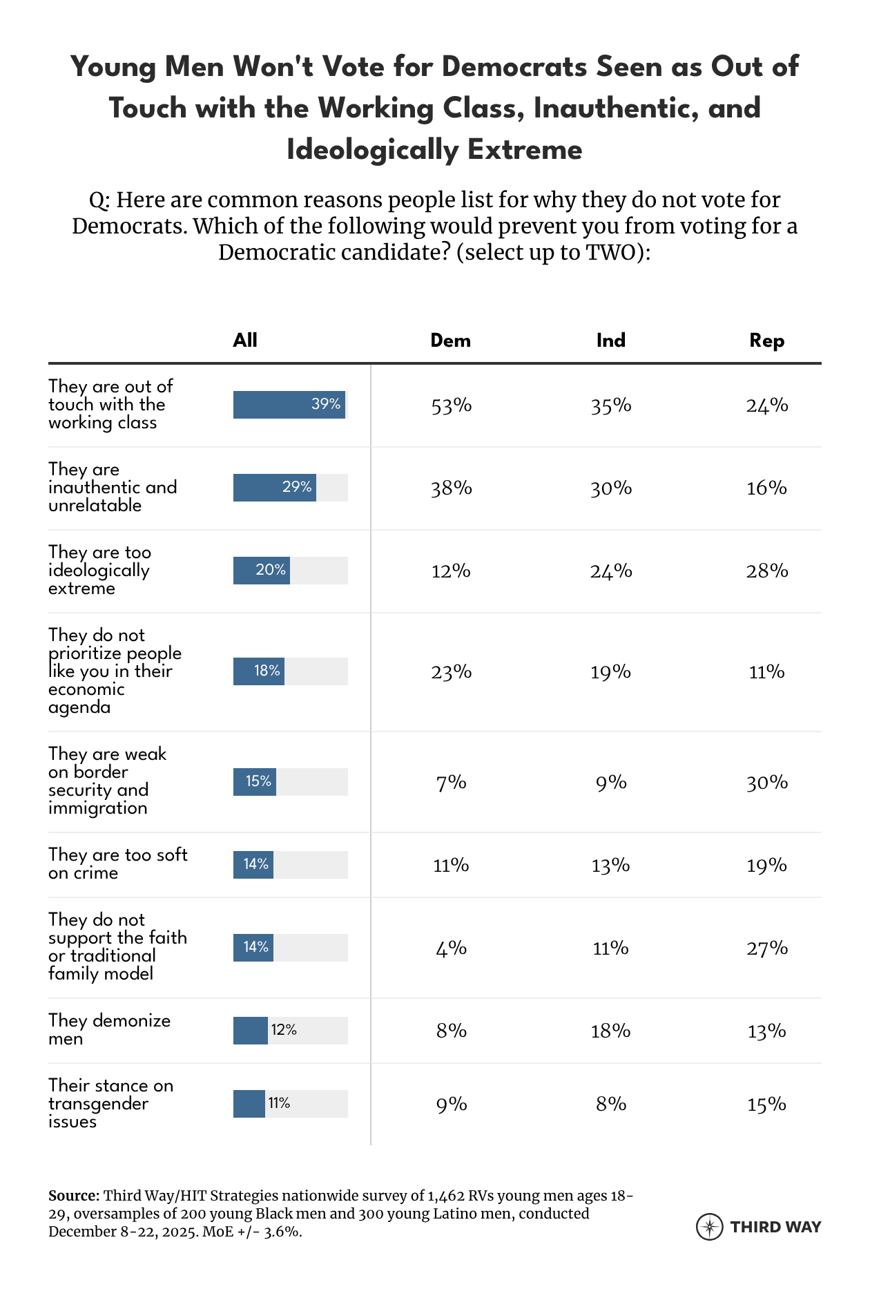 The greatest reservations that would prevent young men from voting for Democratic candidates are “being out of touch with the working class” (39%), “being inauthentic and unrelatable” (29%), and “being too ideologically extreme” (20%).
