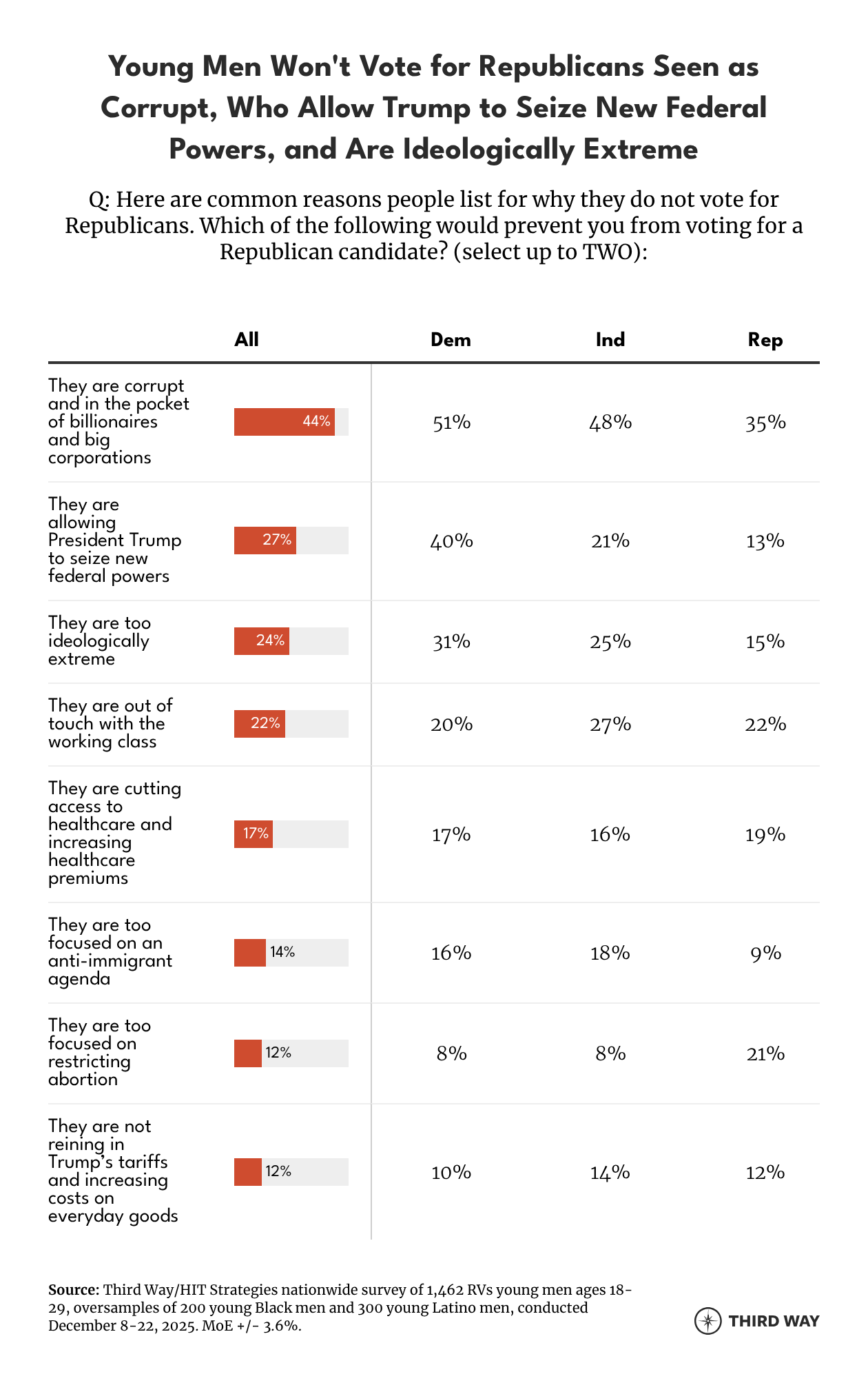 Alternatively, the top reasons that would prevent young men from voting for a Republican candidate include being “corrupt and in the pocket of billionaires and big corporations” (44%), “allowing President Trump to seize new federal powers” (27%), and being “too ideologically extreme” (24%).