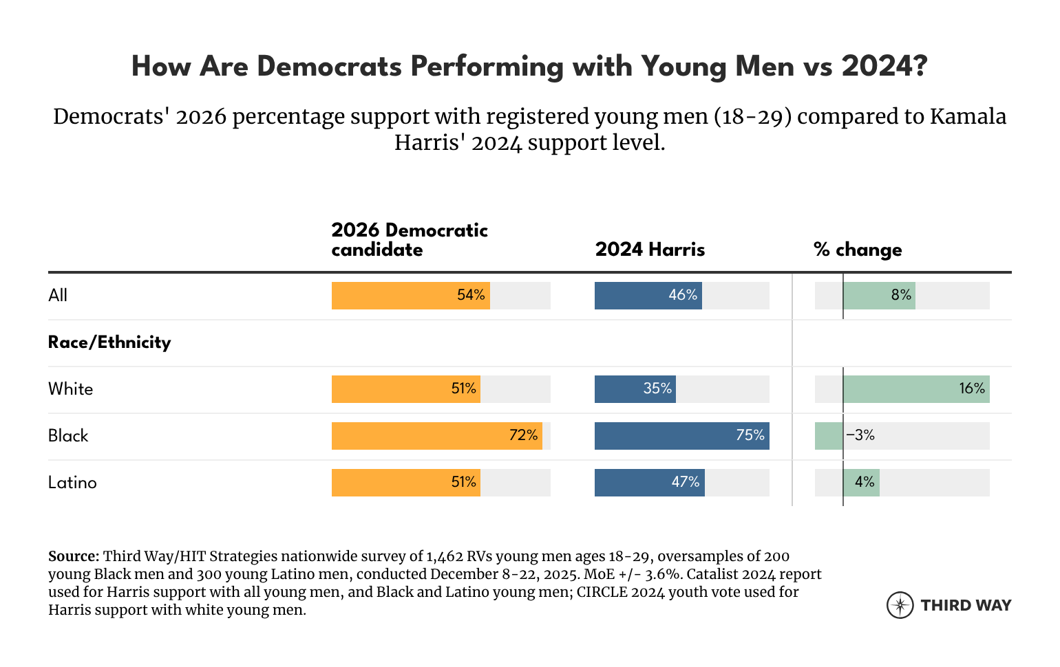 This pattern is consistent with Catalist data from the last four election cycles, which shows that Democratic support among young men declined by six points between the 2018 midterms and the 2020 presidential election and by 12 points between the 2022 midterms and the 2024 presidential election. While Democrats should feel hopeful and motivated for 2026, an off-year election that will primarily be a referendum on Trump, does not necessarily indicate that Democrats have solved all their vulnerabilities with young men, especially in presidential election years when a more moderate and conservative electorate will be turning out to vote.