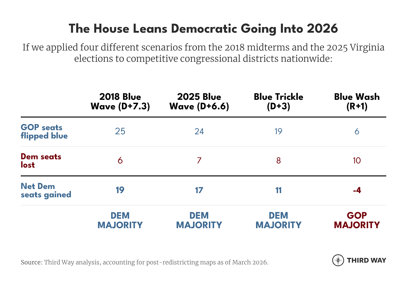 We applied four different scenarios for what the 2026 midterms might look like, factoring in the new Republican and Democratic House districts that have been implemented through redistricting (as of March 2026).1
