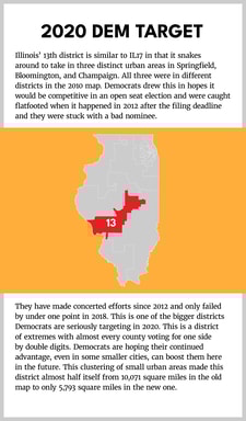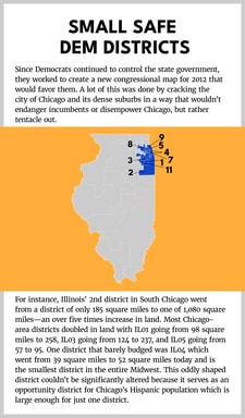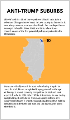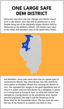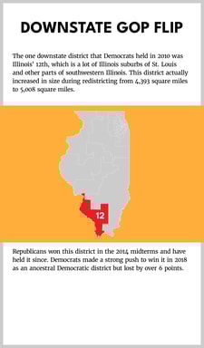 After the 2010 election, Democrats in Illinois redrew the new Congressional map so that 10 of the 18 districts would be reliably and safely Democrat. Ever since, Democrats have won all 10 of these districts in every cycle. Nine of the 10 are in Chicago and its immediate dense suburbs. Seven of the 10 were holdovers from 2010, while three were newly configured districts made more Democratic by shrinking them.