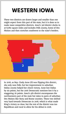 Iowa has a non-partisan commission draw its Congressional maps. It does so in a way that tries to make the districts geographically and politically diverse for Iowa standards. The districts each generally consist of the quadrant of the state since 2012, when reapportionment dropped Iowa from five districts to four. The three Iowa districts that Democrats currently hold are the second, third, and fifth largest in the entire Midwest, due in part to Iowa’s quirky redistricting.
