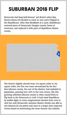 Kansas had a Republican gerrymander in 2011, which helped to cement the gains they made in 2010 when they flipped the Kansas City-based KS03 district from blue to red. Republicans continued to hold this district until it flipped back to Democrats in 2018. This district is the only small suburban one in the state while the three larger districts have been in Republican hands since 2008; though, KS02 has seen close elections thanks to housing mid-sized cities including a large college town.