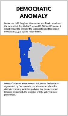 The smallest district currently held by a Republican House Member in the Midwest is Missouri’s 2nd district at 465 square miles, while the largest district currently represented by Democrats is a bit of an anomaly. It is Minnesota’s 7th district, which is a Romney-Trump district represented by Blue Dog Collin Peterson. Minnesota’s 7th clocks in at 33,429 square miles and is the fifth largest in the Midwest. Peterson is a Blue Dog and arguably the most conservative Democrat in the House. Peterson is a strong advocate for gun owner rights and opposes many environmental regulations impacting the agriculture industry. He has been in Congress since 1991 and is only able to win this seat due to his own personal popularity and brand, and this seat will almost certainly flip hands when Peterson decides to retire.