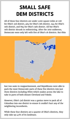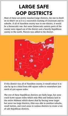 Ohio featured the most successful Republican gerrymander, perhaps in the country for one main reason. They were smart enough to pack Columbus into one district. By giving away one district, they were able to draw an obscene partisan gerrymander overall that locked in a twelve-to-six delegation majority for the entire decade.